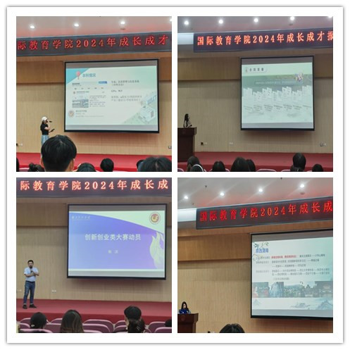 紧接着,学院靳洪副院长重点讲解了中国国际大学生创新创业大赛报名事宜,并介绍了校内创新创业相关的训练课程,鼓励同学们积极报名参与赛事。他殷切期待2022级、2023级的同学们可以在这些赛事中奋发有为取得可喜的成绩。