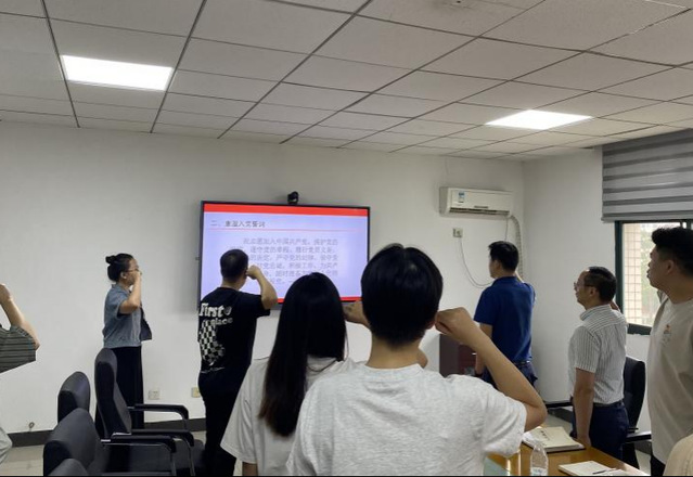 会议第一项,全体起立奏唱国歌,气氛庄严肃穆,预备党员熊文洁同志领誓,全体党员重温入党誓词,牢记初心使命。