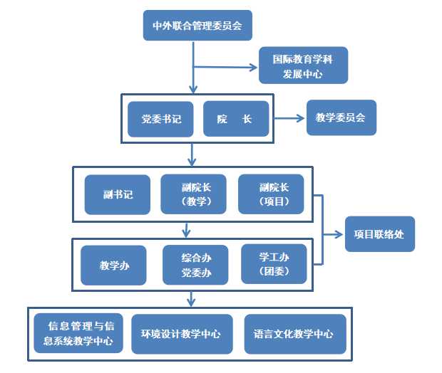 太阳集团tyc33455的组织架构依据项目设立中外联合管理委员会、国际教育学科发展中心、太阳集团tyc33455管理团队、教学委员会和教学中心等。